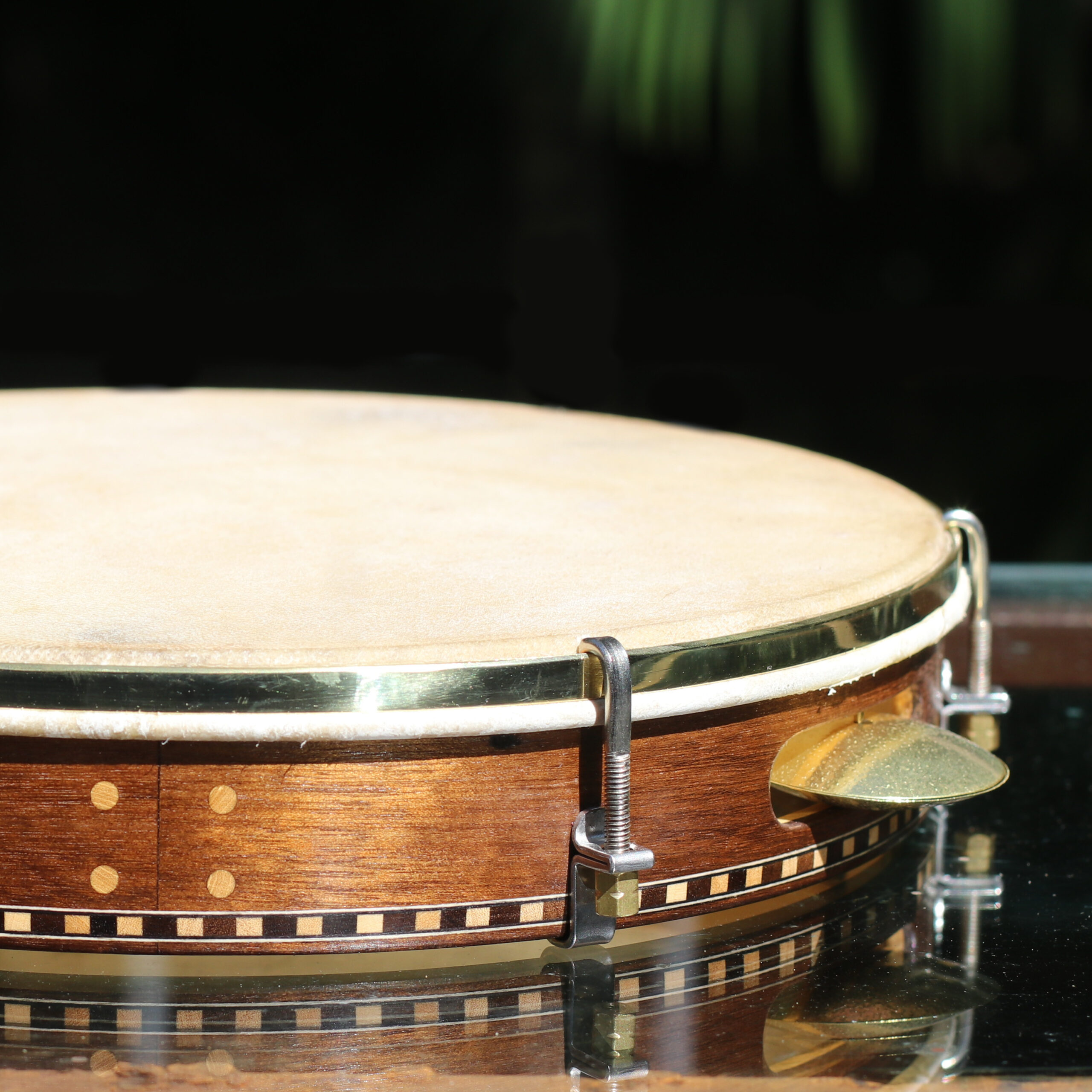 Conta com 5 ou 6 pares de platinelas marteladas em latão, torres em inox encaixadas, aro em latão e couro de cabra, produzindo um timbre rico, quente e expressivo.